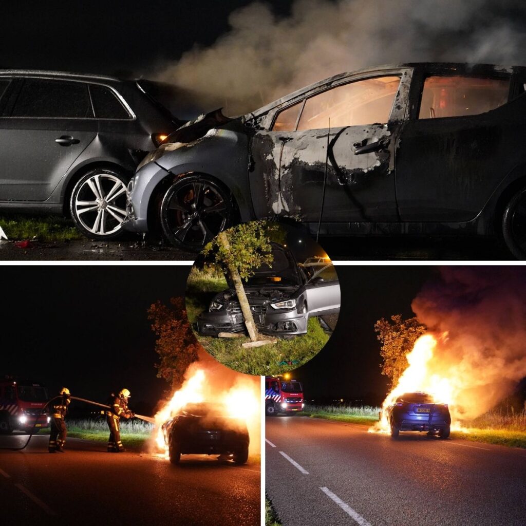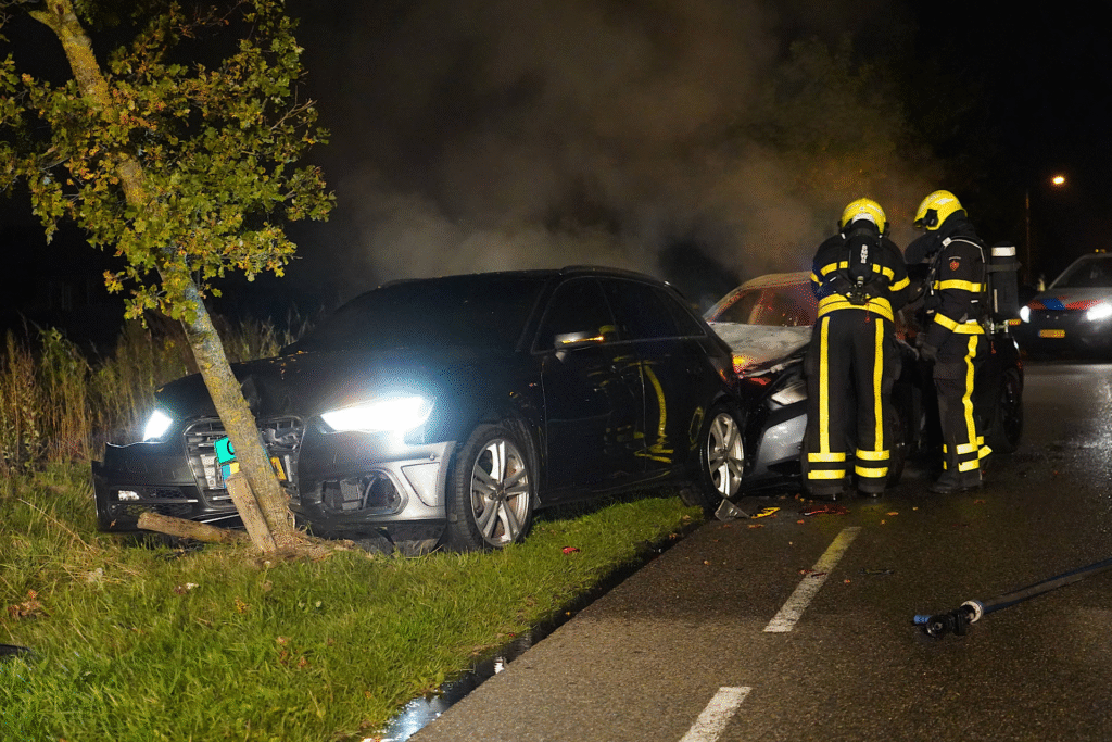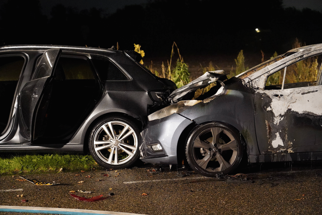 Kort na de botsing vatte eerst de achteropkomende auto vlam, gevolgd door de andere auto.