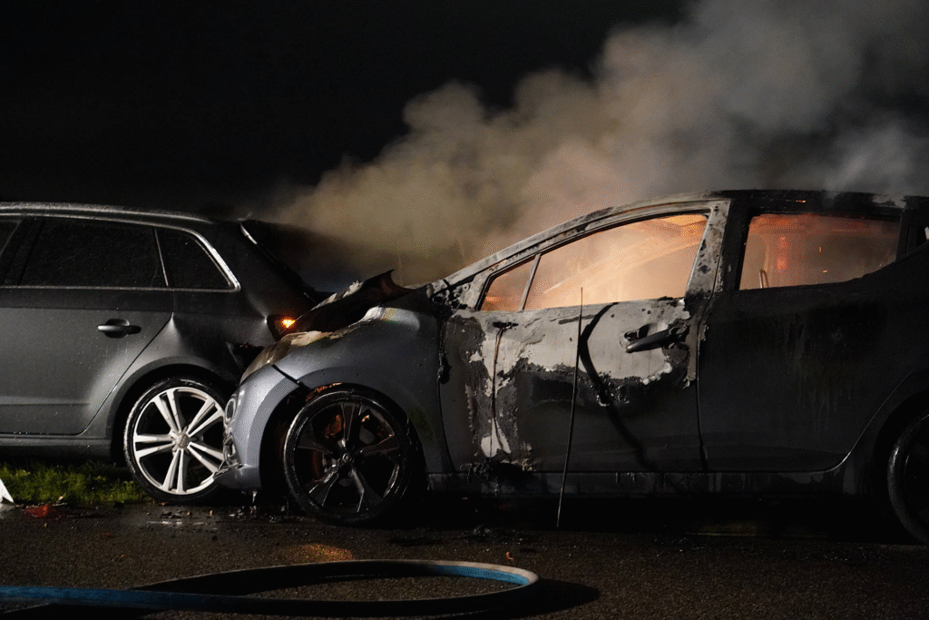 De brandweer was snel ter plaatse, maar kon niet voorkomen dat beide voertuigen zwaar beschadigd raakten door de brand.