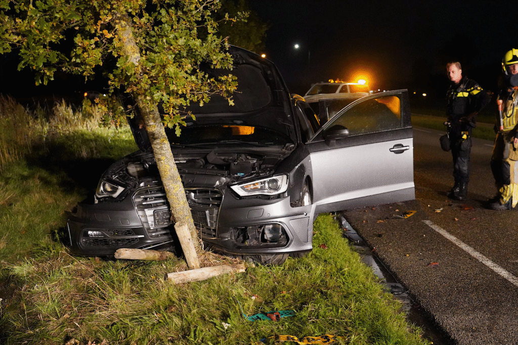 Door de klap werd de stilstaande auto naar voren gedrukt en kwam tegen een boom tot stilstand.