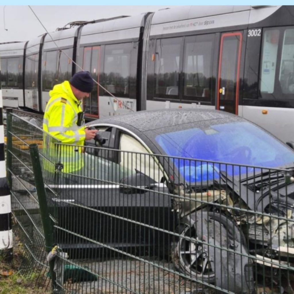 De auto, die een blauw kenteken lijkt te hebben, is door een kraan van de politie van het spoor gehaald. Omdat het om een elektrische auto gaat, moest de wagen in een speciale container worden gezet. Forensisch rechercheurs zullen nog verder onderzoek doen naar de Tesla.