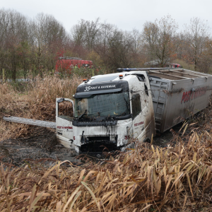 Vrachtwagen belandt in sloot, bestuurder door brandweer uit cabine gehaald