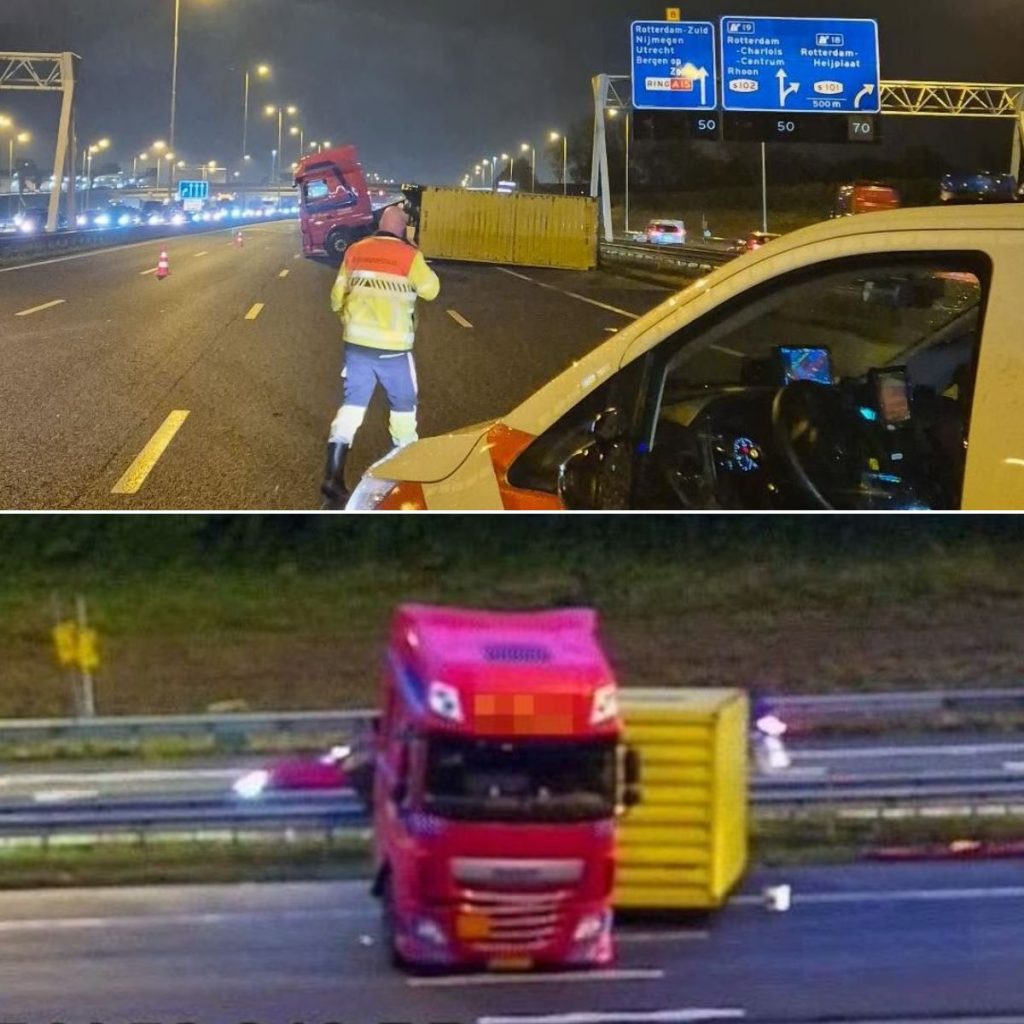Het ongeluk gebeurde rond 05.55 uur. Een vrachtwagen kwam door nog onbekende oorzaak dwars op de weg terecht. De container met oplegger kantelde, waardoor het asfalt en de vangrail beschadigd raakten. De chauffeur bleef ongedeerd.
