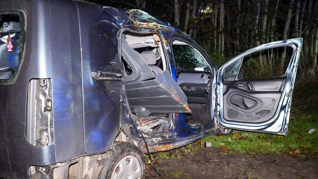 Een bestelbus raakte van de weg in een bocht en botste tegen meerdere bomen, waarna het voertuig tot stilstand kwam in een aangrenzend weiland.