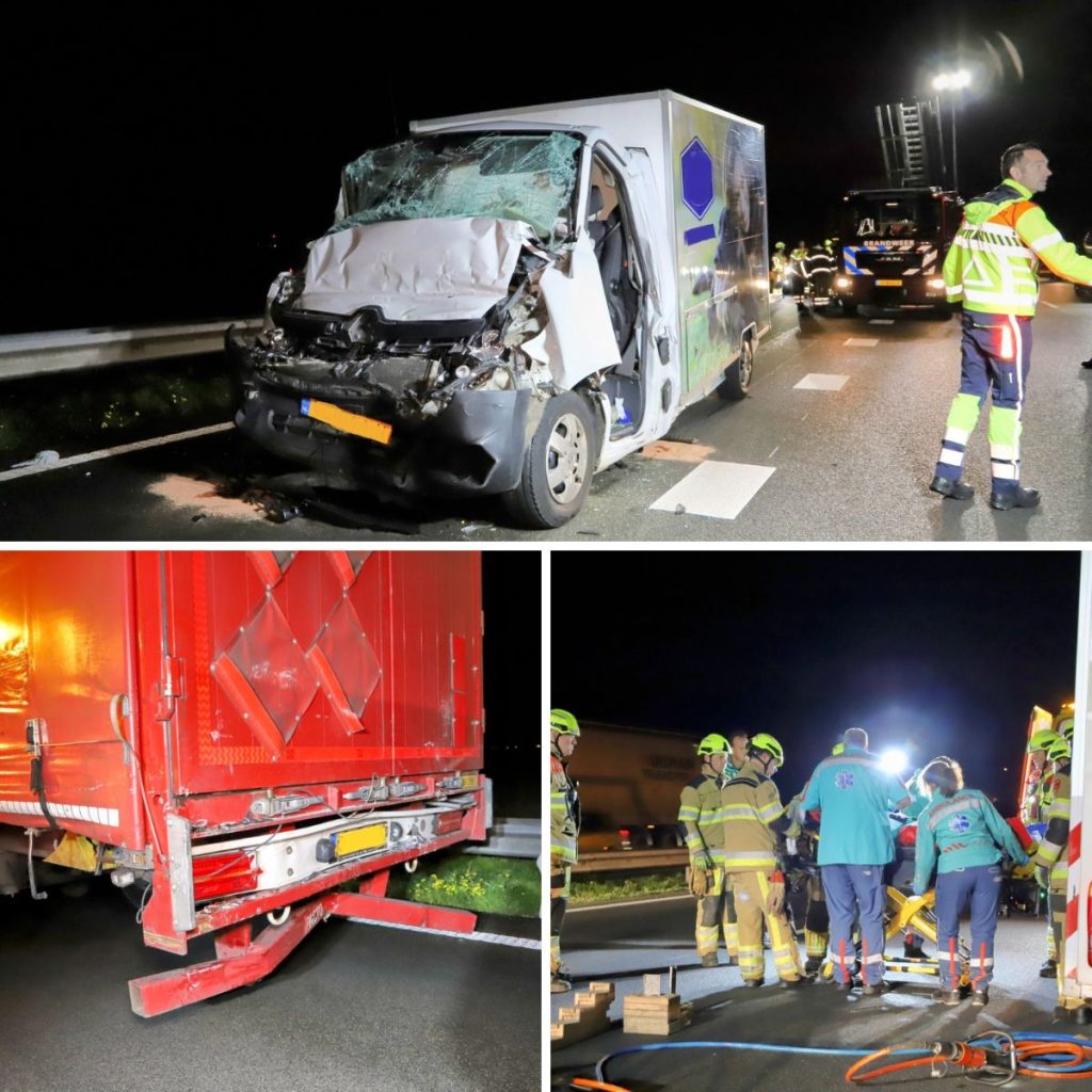 De bestuurder van de bestelauto raakte bekneld en moest door de brandweer worden bevrijd. Hij is met spoed overgebracht naar het ziekenhuis. Een traumahelikopter die was opgeroepen, is uiteindelijk niet ingezet.