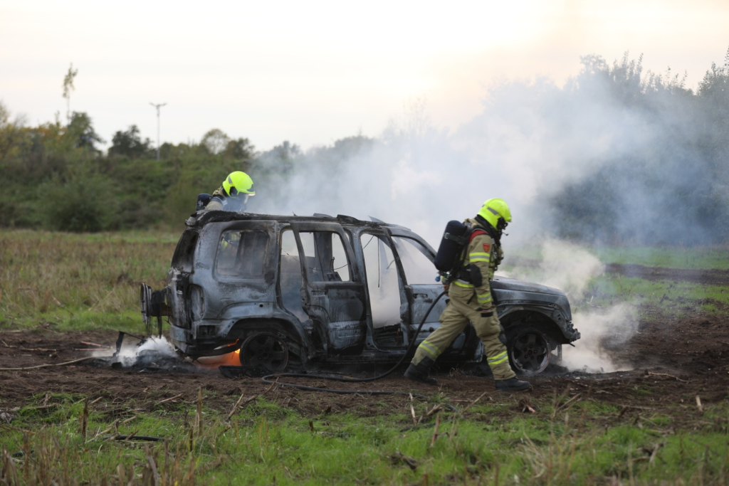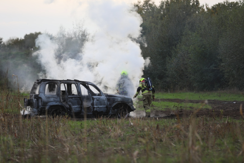 Van de crossauto bleef weinig over. Hoe de brand is ontstaan, is nog niet bekend.