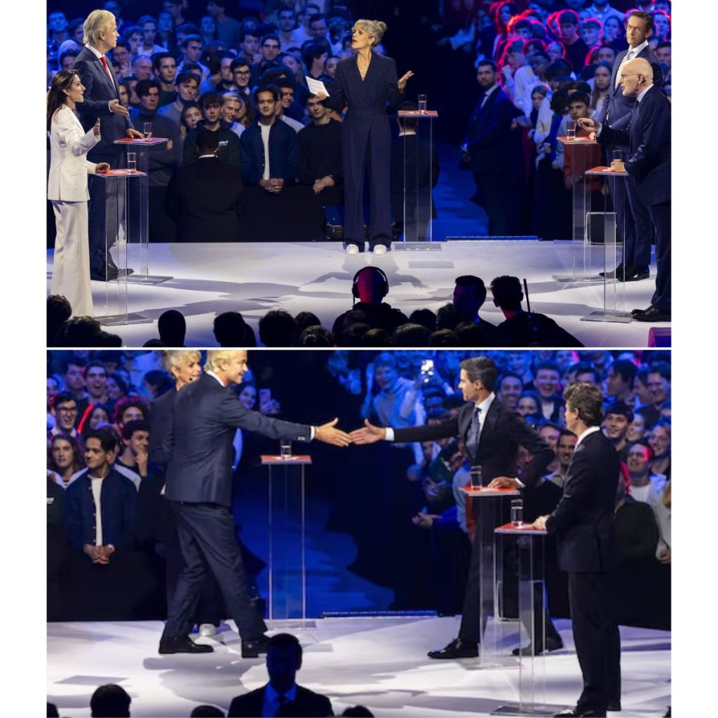 Wilders veert naar achter en loopt vervolgens naar Jetten om hem een hand te geven. Het lijkt alsof de PVV’er Jetten feliciteert met een gemaakt punt, terwijl Jetten Wilders niet bepaald complimenteert. Jetten gaat daarna verder over Wilders’ politiek van ‘hatelijke tweets’ en het ‘zaaien van verdeeldheid’. “We gaan u keihard verslaan.”
