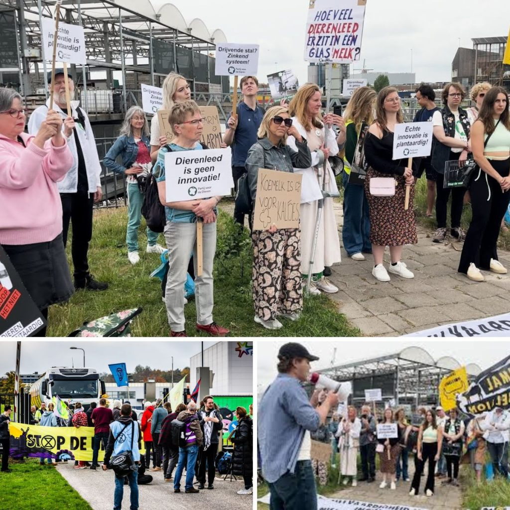 Demonstratie tegen de uitbuiting van koeien bij zuivelfabriek