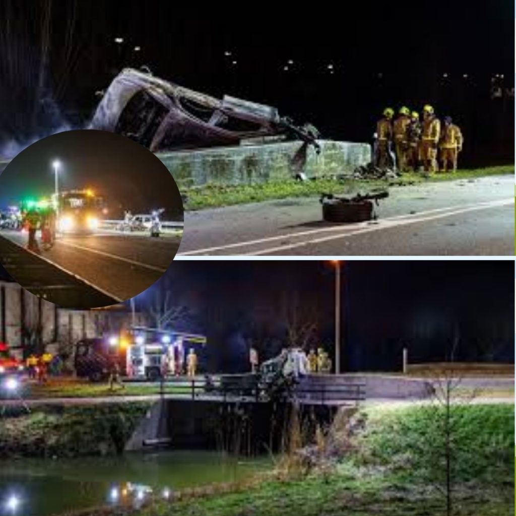 Op beelden is te zien dat de auto half op z’n kop hangt op de rand van een brug. De brokstukken liggen tot meer dan honderd meter verderop. De auto is in brand gevlogen. Het was een eenzijdig ongeluk.