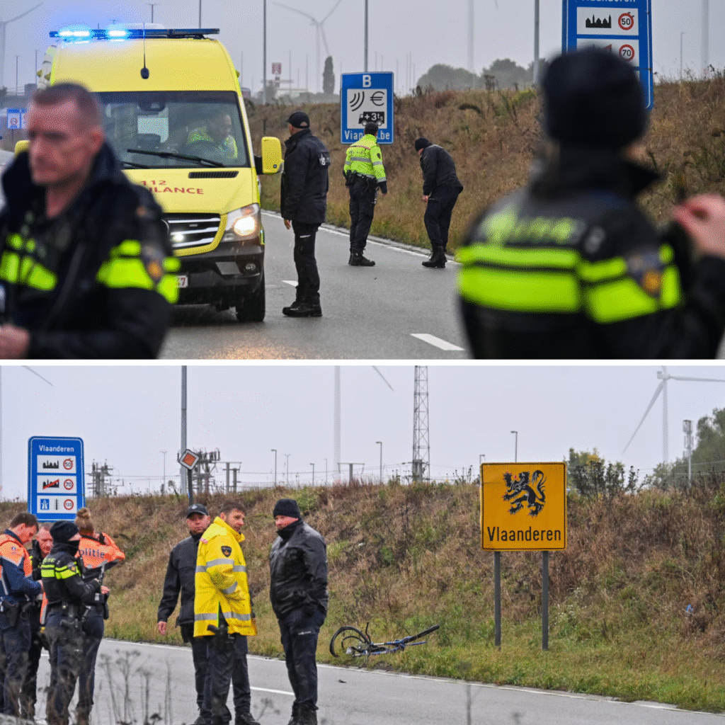 Hulpdiensten uit beide landen kwamen. Het slachtoffer lag bij het eerste verkeersbord dat aanduidt dat weggebruikers België zijn binnengereden. Iets hiervoor in Nederland ligt de grote parkeerplaats voor vrachtwagens.