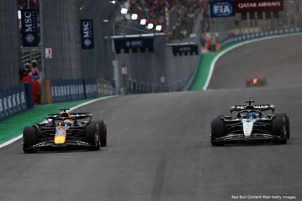 Verstappen begon de GP van São Paulo vanuit de pitstraat en passeert Russell hier voor de derde plaats.