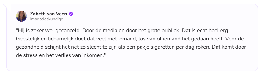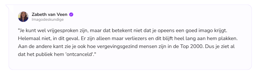 Het lijkt erop dat Nederland vergevingsgezind is: de vijf grootste stijgers in de Top 2000 komen van Marco Borsato. Het nummer ‘De waarheid’ ging van plek 1428 naar 35. Toch is hij echt gecanceld, zegt imagodeskundige Zabeth van Veen bij Dit is de dag (EO).