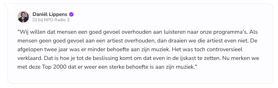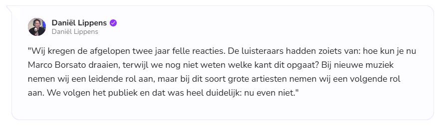 Toch vindt dj Daniël Lippens (NPO Radio 2) dat geen cancelen. Borsato’s muziek is “even in de ijskast gezet” ter afwachting van de uitspraak, vindt hij.