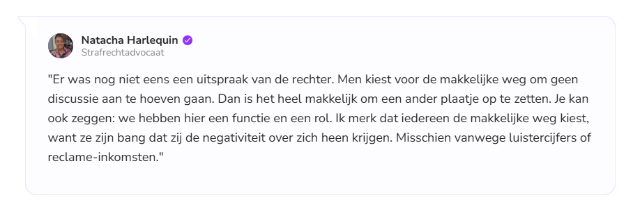 Strafrechtadvocaat Natacha Harlequin vindt toch dat de media daarin een grotere rol spelen. Mensen nemen te snel de makkelijke weg, zegt ze.