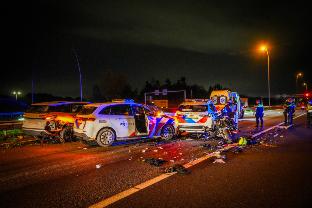 Het ongeval gebeurde iets na 07.00 uur tijdens de achtervolging van een gestolen auto. De bestuurder botste daarbij op twee politieauto’s en twee politiemotoren.