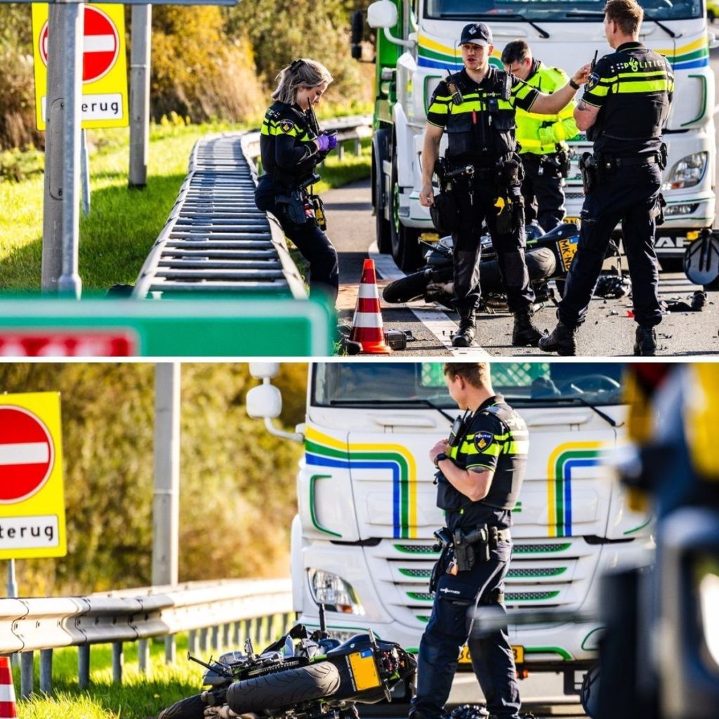 Het ongeluk gebeurde rond 10:30 uur. De hulpdiensten, waaronder een traumahelikopter, rukten massaal uit. De traumahelikopter landde naast de snelweg. De motorrijder is achterop de vrachtwagencombinatie geklapt voor het stoplicht op de afrit.
