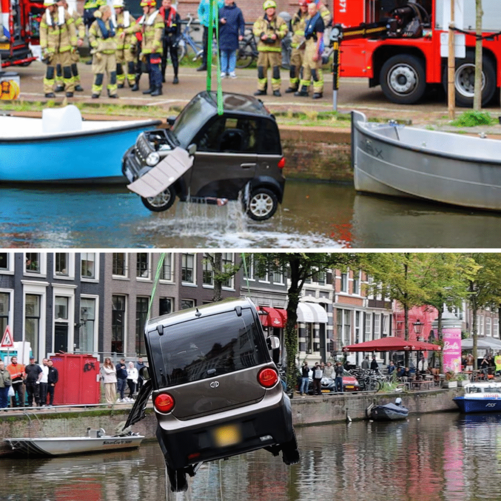 Eén verkeerde parkeeractie en de brommobiel van een moeder (37) ging maandagmiddag kopje onder in de Herengracht in Amsterdam. De 30-jarige Tijn Nieuwenhuizen dook het water in om te helpen. Met ‘ontzettend veel geluk’ voelde bij zijn derde duikpoging de jas van het 3-jarige dochtertje van de vrouw en kon hij het meisje uit de brommobiel omhoog trekken. Het had niet veel gescheeld of het was heel anders afgelopen.