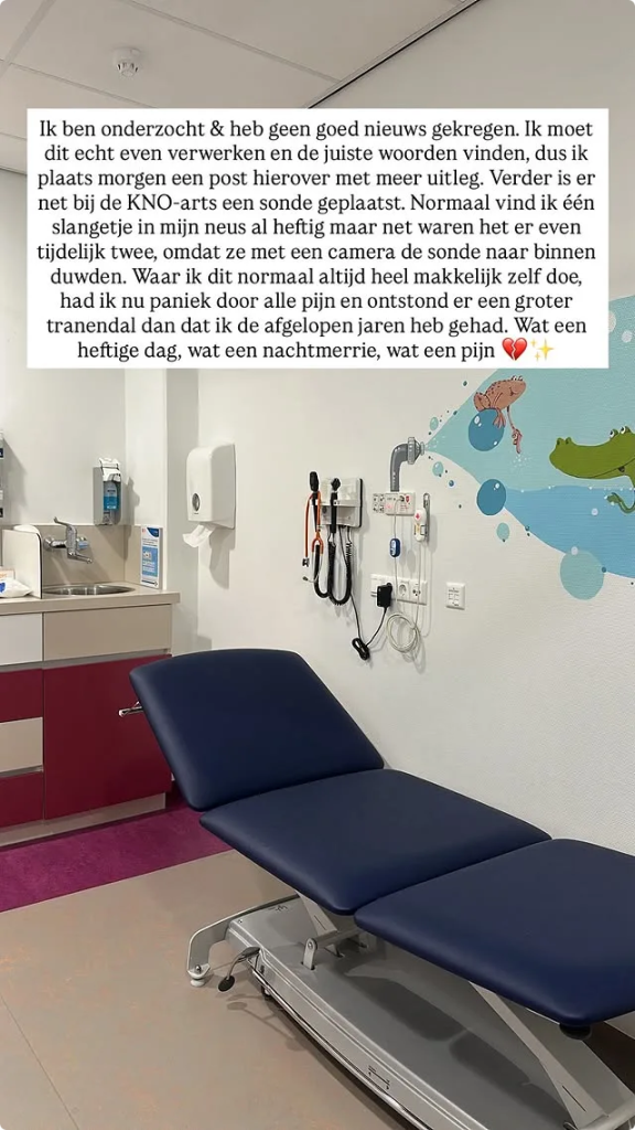 Jade is wel erg aangeslagen na haar bezoek, vervolgt ze. “Er is net bij de KNO-arts een sonde geplaatst. Normaal vind ik één slangetje in mijn neus al heftig, maar net waren het er even tijdelijk twee, omdat ze met een camera de sonde naar binnen duwden.” Normaliter doet ze dit naar eigen zeggen “makkelijk” zelf, maar dit keer had ze “paniek door alle pijn”. “En ontstond er een groter tranendal dan dat ik de afgelopen jaren heb gehad. Wat een heftige dag, wat een nachtmerrie, wat een pijn.”