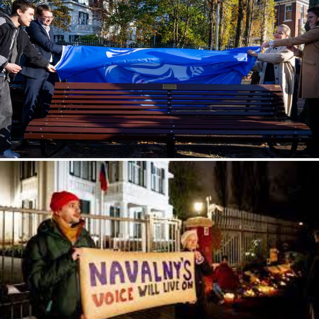 Op een bank tegenover de Russische ambassade in Den Haag is een plaquette ter ere van de overleden Russische oppositieleider Alexei Navalny geplaatst. Zijn weduwe Yulia Navalnaya was aanwezig bij de onthulling.