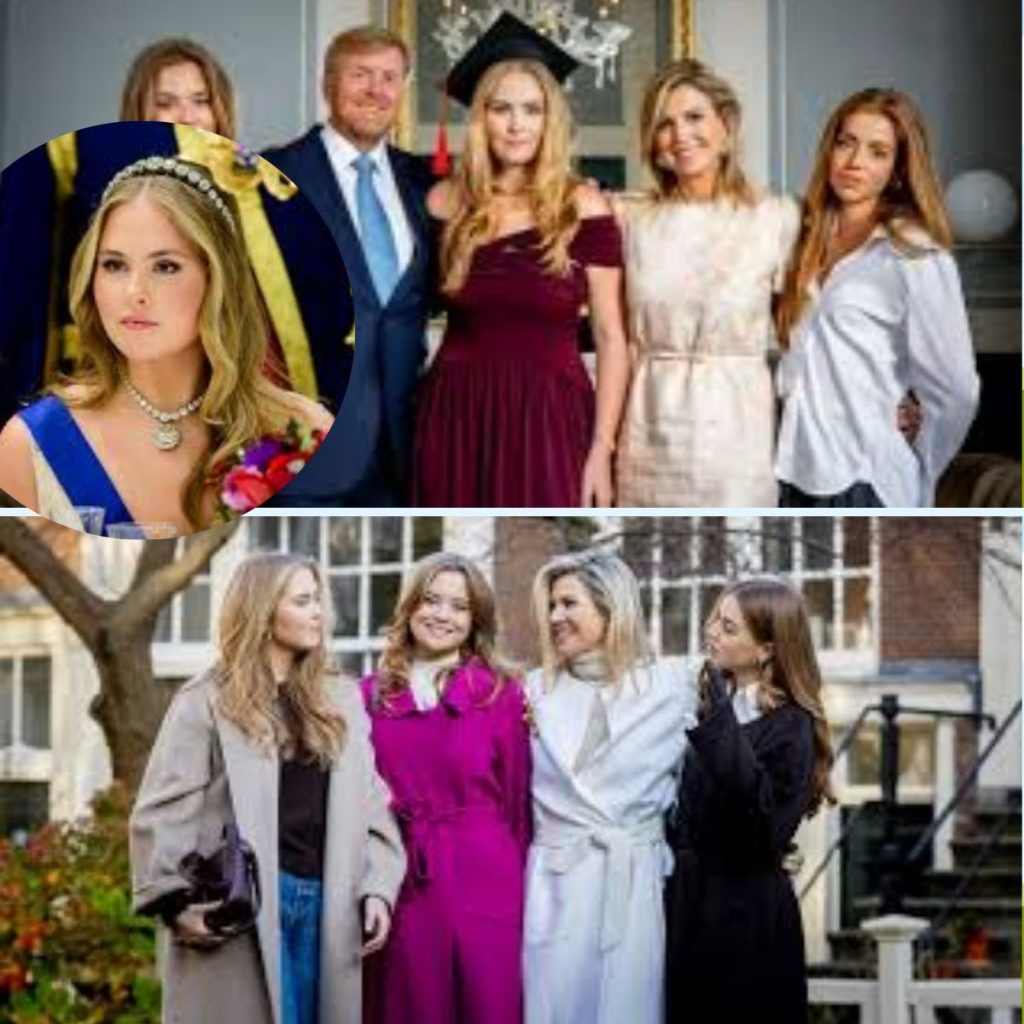 De complete koninklijke familie is te zien op de foto, met prinses Amalia als stralend middelpunt. Ze draagt een bordeauxrode jurk met blote schouders en heeft een afstudeerhoed op. Naast haar staan koning Willem-Alexander en koningin Máxima. Prinsessen Alexia en Ariane zijn op de flanken te zien.