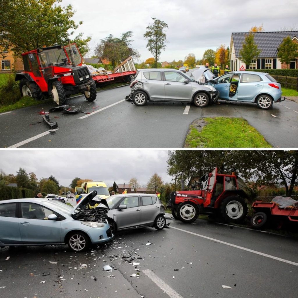 Ravage na harde botsing tussen auto’s en tractor in Harskamp