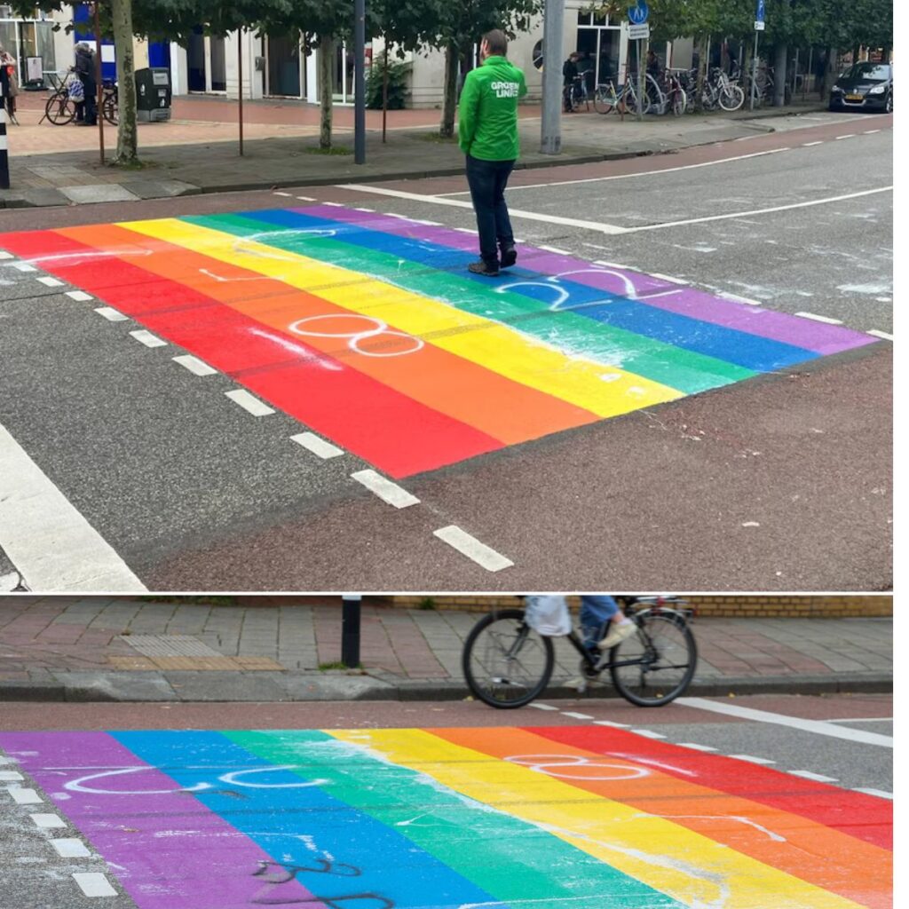 Het regenboogpad op de Hoofdstraat in Velp is in de nacht van zaterdag op zondag opnieuw beklad, kort na een spontane pride-actie als reactie op een eerdere vandalismezaak deze week.
