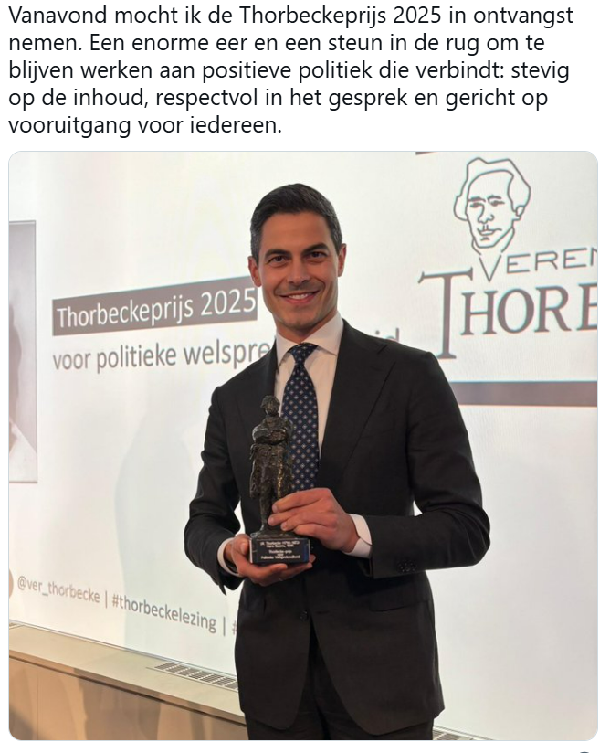 Jetten nam de prijs in Nieuwspoort in ontvangst. De D66-leider zei te hopen samen met Coenradie en Dijk ‘eerlijkheid, onbevangenheid en vrolijkheid’ in het politieke debat vast te kunnen houden en daar een voorbeeld in te geven. “Niet alleen voor onze 147 collega’s of voor de mensen in het land, maar ook voor al die andere politieke generaties die nog moeten komen.”