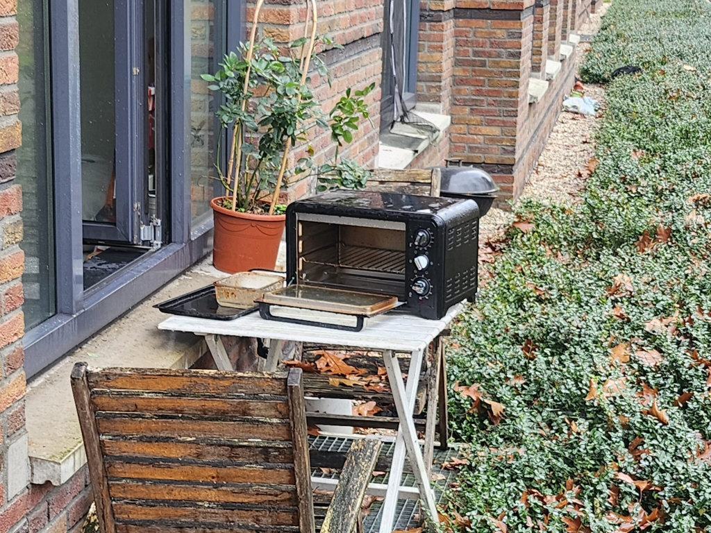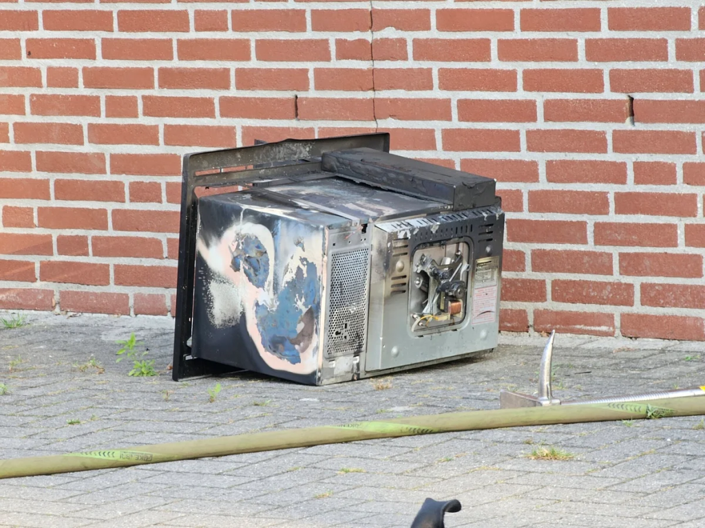 De oven is naar buiten gebracht en geblust. Vervolgens zijn de kamer en de gang geventileerd.