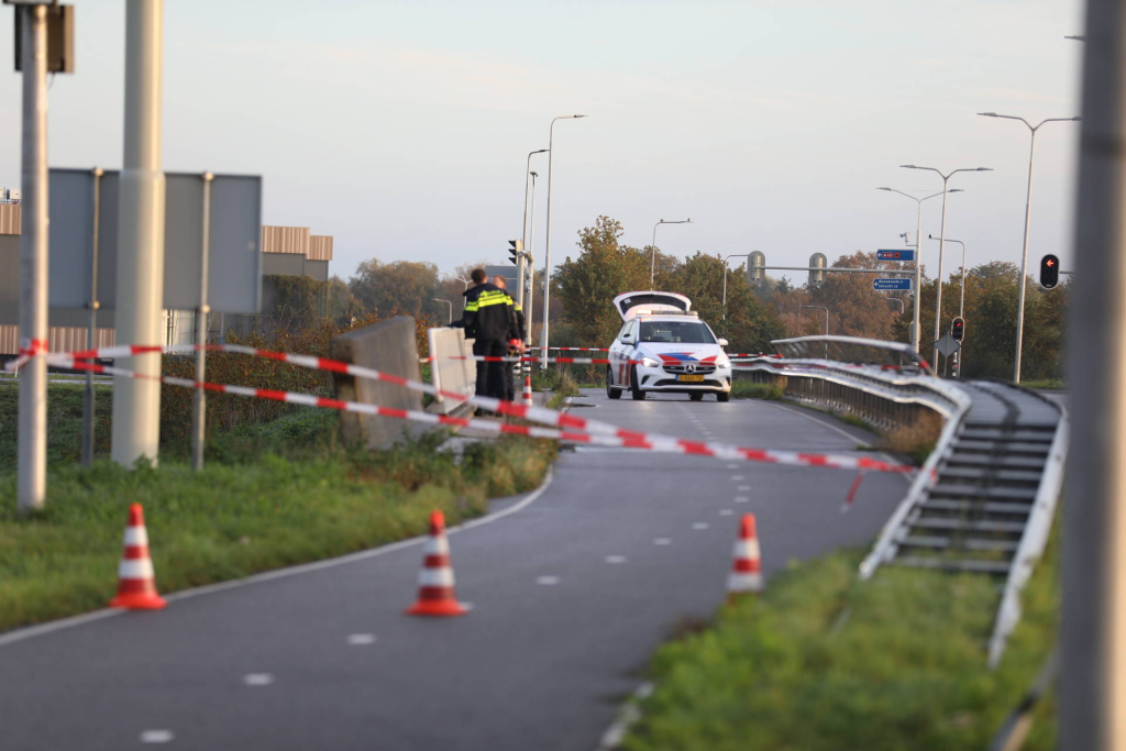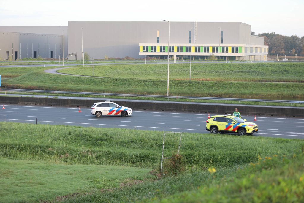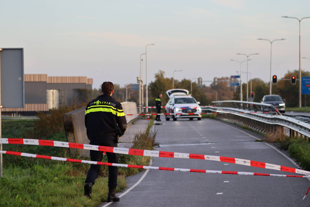 Meerdere politiewagens stonden zowel op de snelweg als op het viaduct stil. Het slachtoffer is per ambulance afgevoerd.