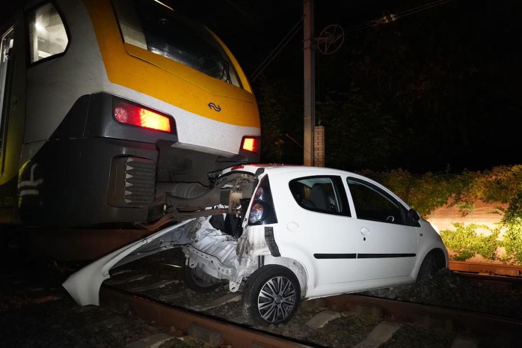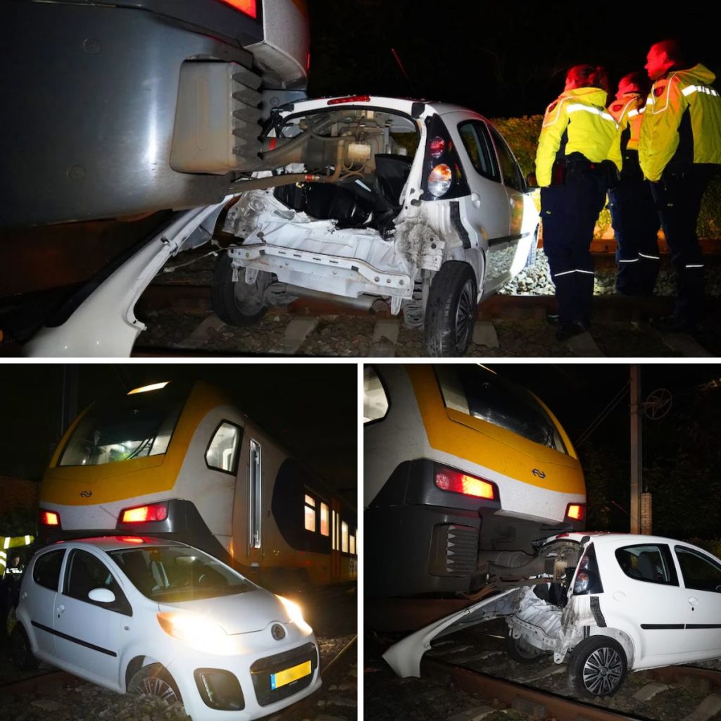 De aankomende trein kon niet meer op tijd remmen voor de auto en sleurde deze nog enkele meter mee. De auto is total loss, maar de bestuurster en de mensen in de trein bleven allemaal ongedeerd.