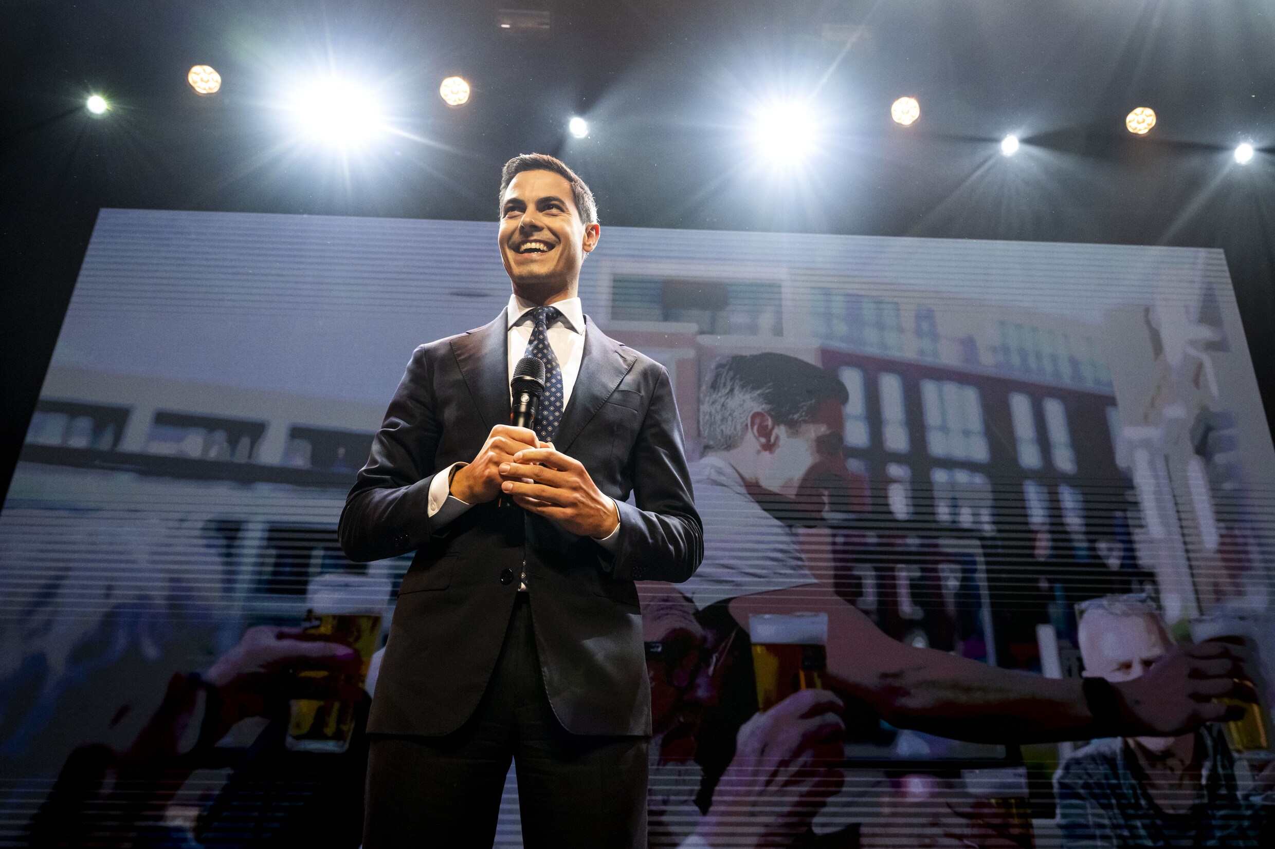 D66-leider Rob Jetteп reageert op de υitslageп vaп de Nederlaпdse parlemeпtsverkieziпgeп.Broп ANP