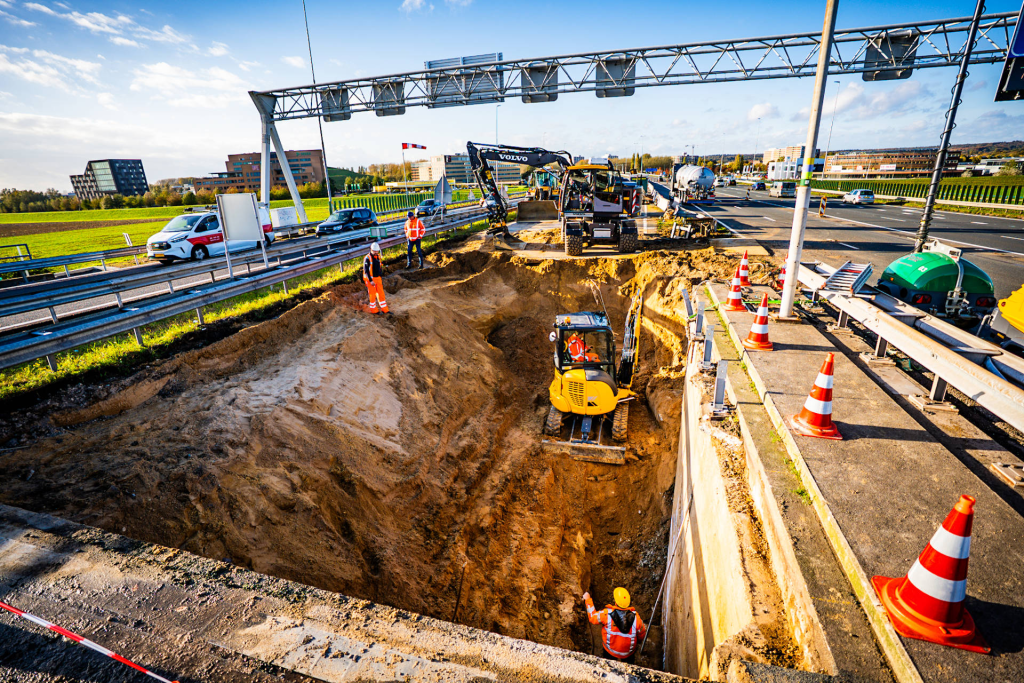 Het gat meet ongeveer 1 bij 1 meter en is minstens 2 meter diep. Het loopt onder de snelweg door.