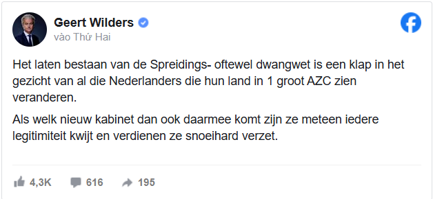 Hij zei letterlijk: “Het laten bestaan van de Spreidings- ofwel dwangwet is een klap in het gezicht van al die Nederlanders die hun land in één groot AZC zien veranderen.”