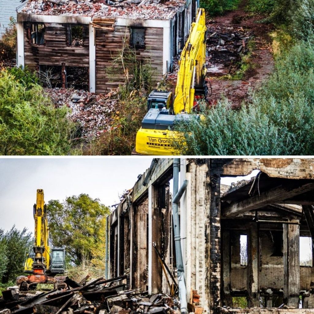 Een felgele kraan is ‘s morgens vroeg tussen het groen van struiken en bomen bezig om de restanten van het pand te ordenen. Wat nog over is van de begane grond zal gesloopt worden.